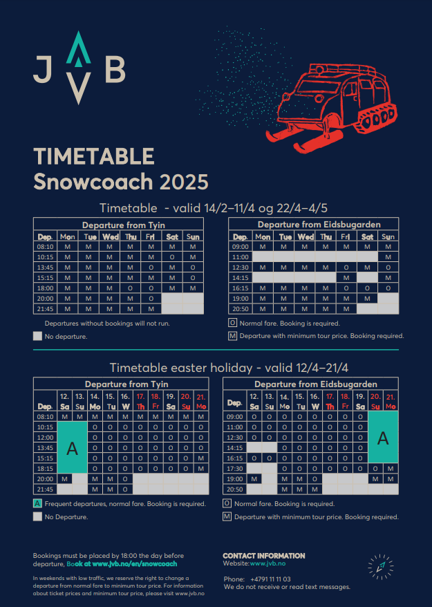 Hjem 5 Timetables 5 SnowcoachTimetable snowcoachThe snowcoaches operates from February 14th to May 4th 2025.Book your tickets here.Timetable Read the Timetable